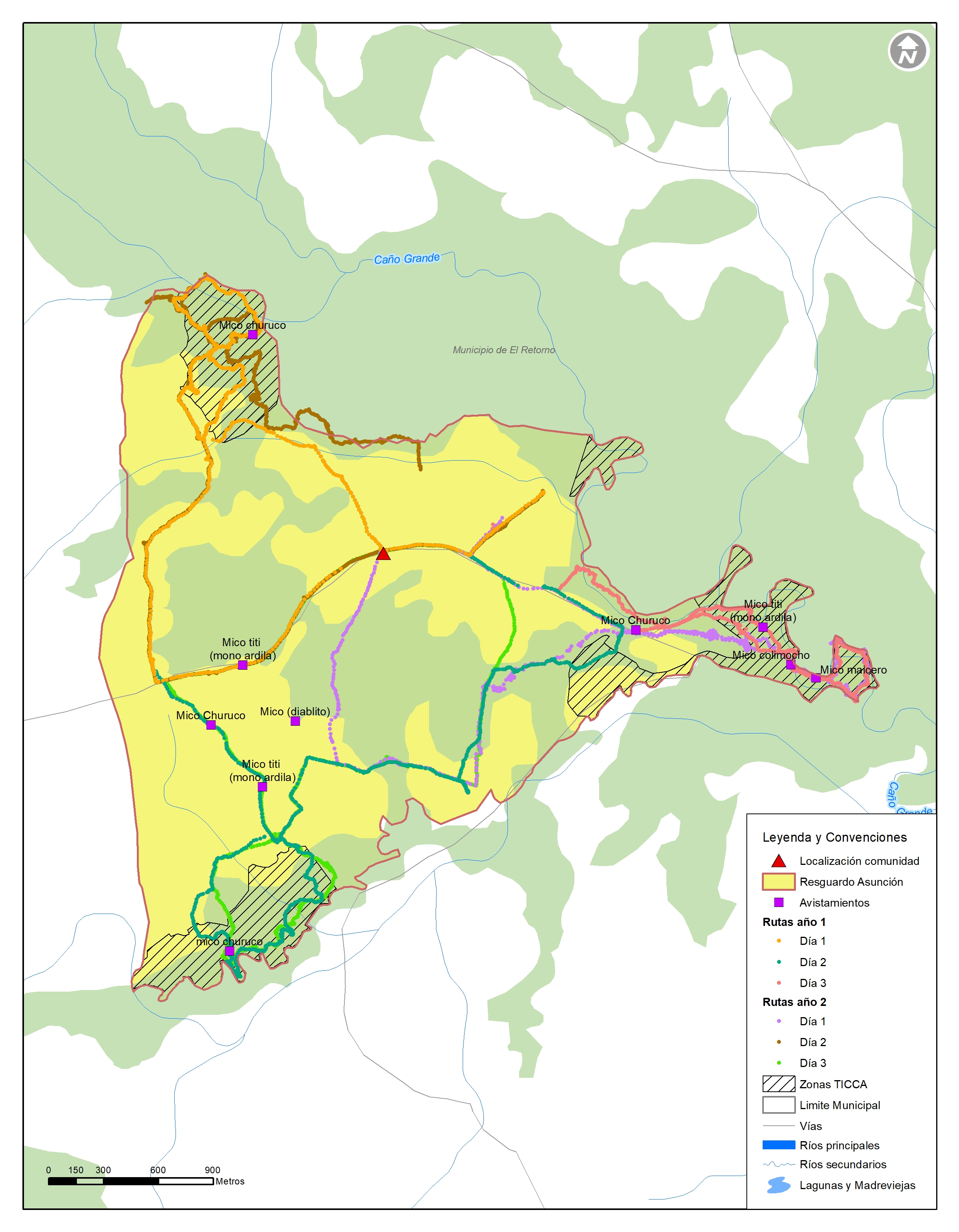Para identificar especies de animales presentes en nuestro territorio realizamos recorridos en las áreas de conservación de cada resguardo durante tres días. En estos recorridos registramos las coordenadas y el número de animales avistados, así como la fecha y hora del avistamiento. Para la identificación usamos las guías de campo de aves y mamíferos.