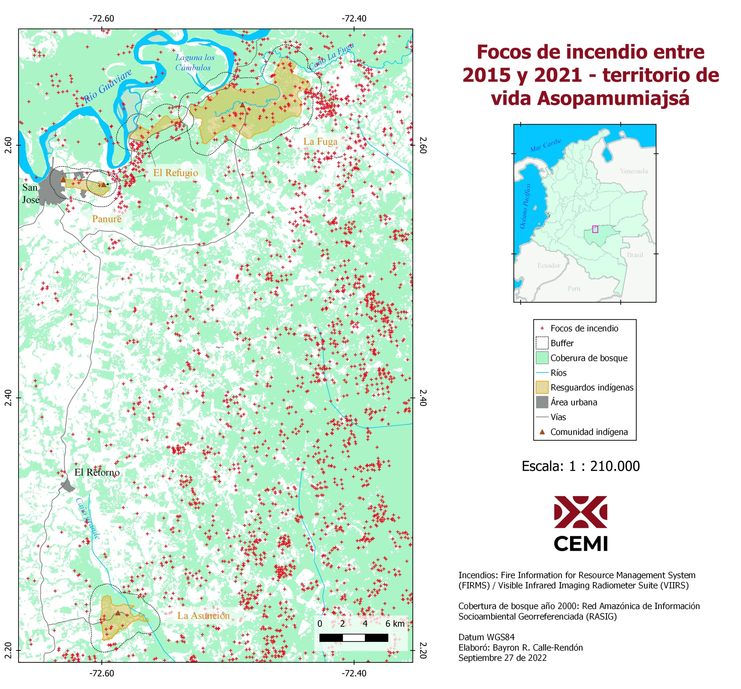 Gracias a nuestro trabajo, hemos podido identificar focos de incendios en nuestro territorio que hemos monitoreado con la ayuda de imágenes satelitales. También hemos notado cambios significativos en los ciclos del calendario tradicional, que se han visto afectados por el calentamiento global. Adicionalmente, hemos estado monitoreando las crecientes de los ríos y caños, y hemos podido observar un aumento de las inundaciones en predios como Villa Leonor en el resguardo La Fuga. Finalmente, estamos enfrentando el problema de la contaminación de nuestros recursos hídricos, de los que dependemos a diario. Nuestros resguardos se han visto afectados por el vertimiento de aguas negras y residuos sólidos de las comunidades vecinas a las cabeceras de los caños, especialmente por las aguas servidas de la capital del departamento en el humedal de Panuré, que es un área que hemos definido para la conservación.